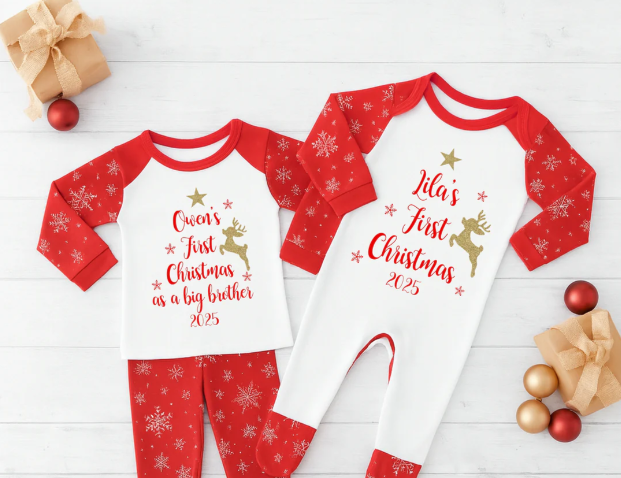 In addition, All About The Bump offers a wide range of personalised baby gifts. You’ll find baby grows and vests with custom names, announcement clothing, and “My First Christmas” collections — including matching sibling outfits, festive pyjamas, personalised stockings, and keepsake decorations. Their seasonal lines suggest care in design and a focus on meaningful, memorable gifts.