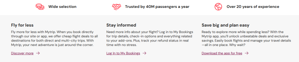 This breadth of offerings makes MyTrip a one‑stop shop for many travel needs, from simple flights to more complex itineraries.