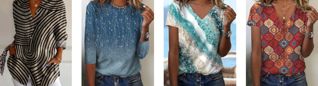 • See many designs, often quite fashionable or trendy (as presented in the website’s images), which may include different cuts, colors, sizes, and styles.