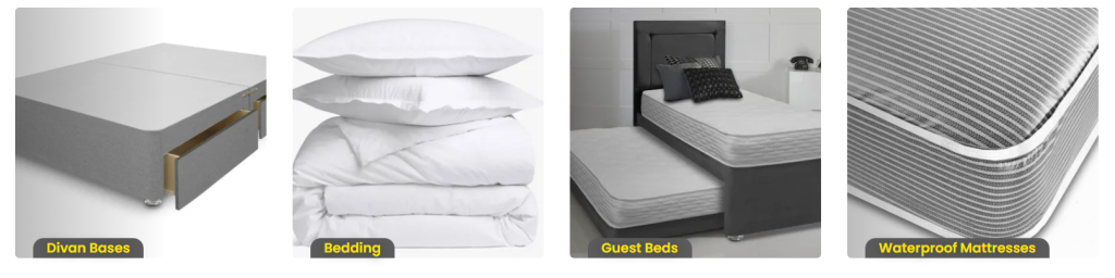 - Beds and Bed Frames: The site features a selection of bed frames in different styles and materials, including divan beds, ottoman storage beds and upholstered frames. These options provide not just a place for the mattress but also add to the bedroom’s aesthetic and functionality.