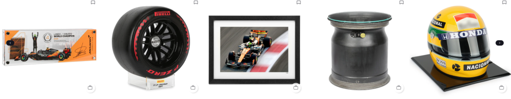 Browsing F1 Authentics feels similar to walking through a motorsport gallery. Dedicated driver collections allow fans to search memorabilia connected to specific racers, while team-based sections organise items by constructor. Racewear and equipment categories include authentic suits, boots, gloves, and helmets, often signed. Car parts and display pieces present real bodywork and mechanical components prepared for presentation. Artwork and photography provide framed visual moments from racing history. Some of the rarest items appear through auctions and private sales, creating a collector-level marketplace rather than a standard online shop. Because of these features, F1 Authentics functions as both store and archive — a hybrid between retail platform and motorsport memorabilia exchange.